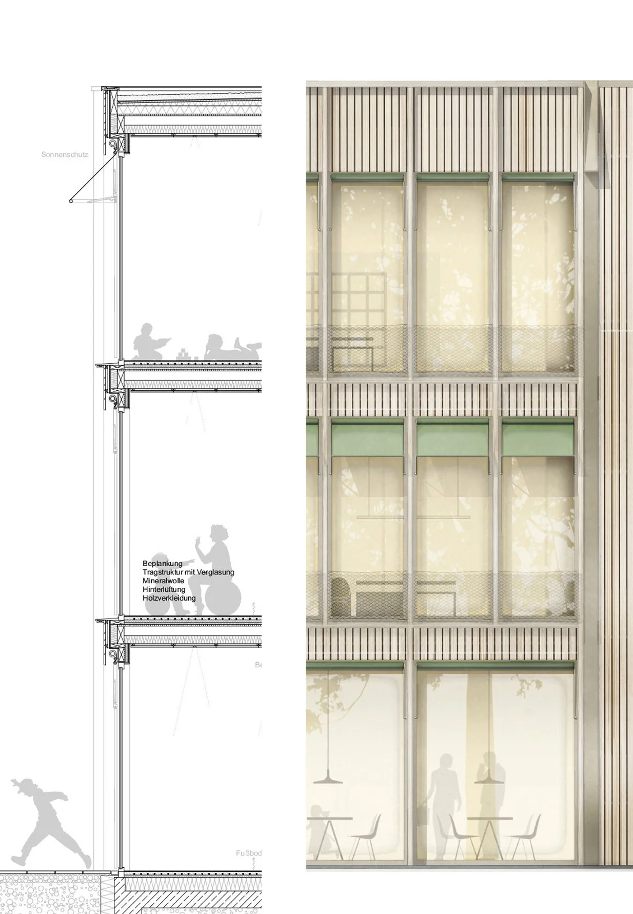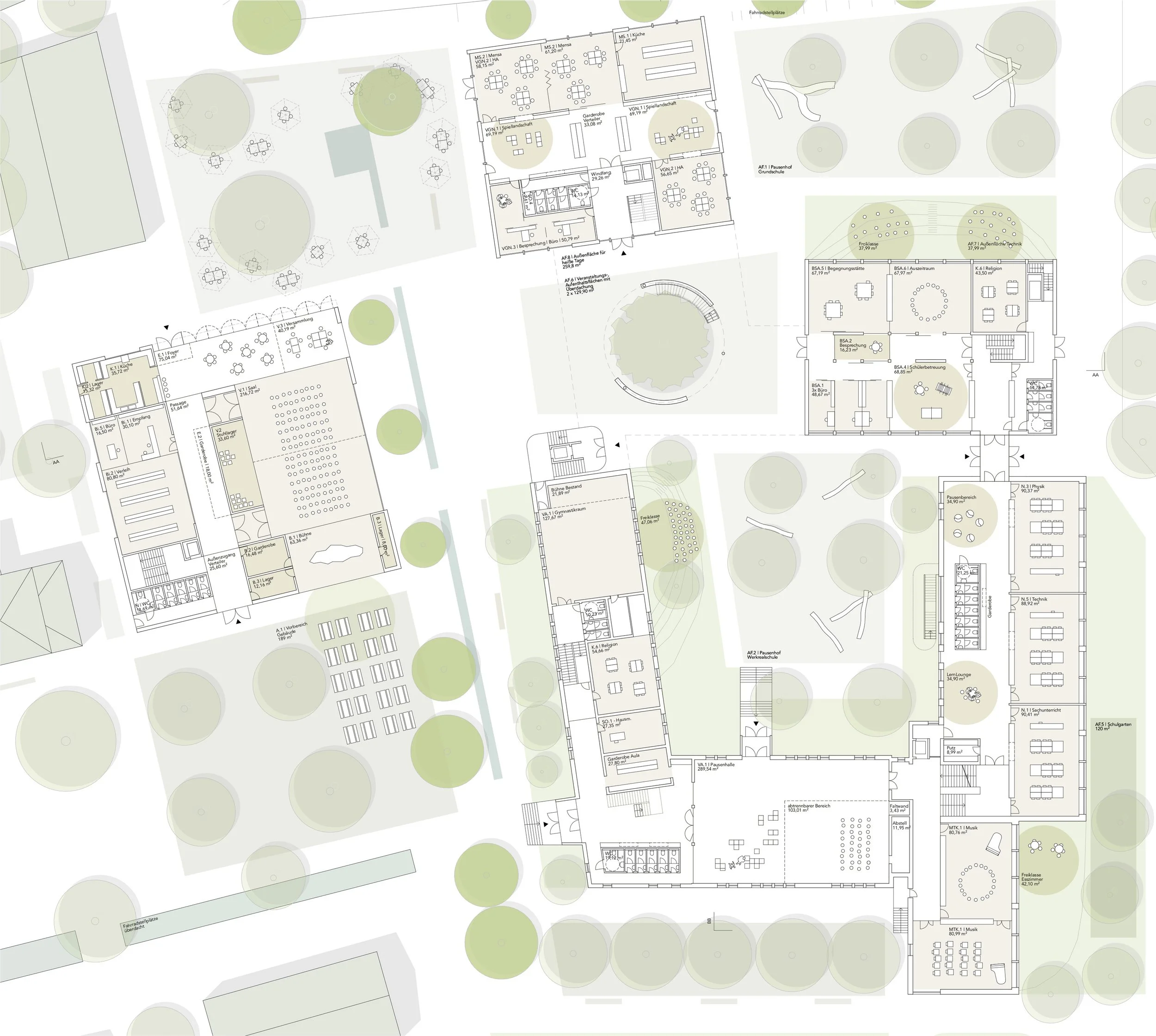 Das Konzept erhält den Bestand und ergänzt Neubauten nur bei Bedarf. Multifunktionale Räume fördern eine effizientere Flächennutzung und naturnahe Freianlagen verlagern den Unterricht nach draußen. Serielle (Sanierungs-) Bauweisen verkürzen die Bauzeit und reduzieren Interimskosten, während systemoffene Neubauten die jeweils wirtschaftlichste Bauweise – Massiv- oder Holzbau – ermöglichen. Langlebige, pflegeleichte Materialien sowie ein dezentraler Low-Tech-Ansatz für Heizung und Lüftung minimieren Betriebskosten. Photovoltaikanlagen auf allen Dächern erzeugen Energie direkt für den Betrieb und steigern die Kosteneffizienz.