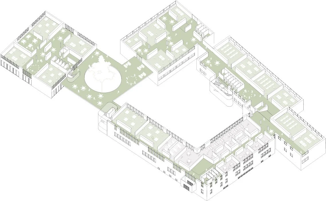 Die Mörburgschule schafft flexible und transparente Lernumgebungen durch Clusterstrukturen, die eigenständiges Lernen und Zusammenarbeit fördern. Offene Differenzierungsbereiche und leichte Tragstrukturen ermöglichen flexible Weiterentwicklungen des pädagogischen Konzepts. Der „Loop“ im ersten Obergeschoss verbindet alle Gebäudeteile und ersetzt klassische Flure durch mehrfach aktivierte Flächen. Das Konzept setzt auf natürliches Licht und Belüftung für eine gesunde Lernumgebung. Helle, gut einsehbare Bereiche fördern ein offenes Miteinander und beugen Mobbing vor. Unisex-Toiletten mit einladenden Vorräumen erhöhen die Sicherheit und unterstützen eine inklusive Atmosphäre.