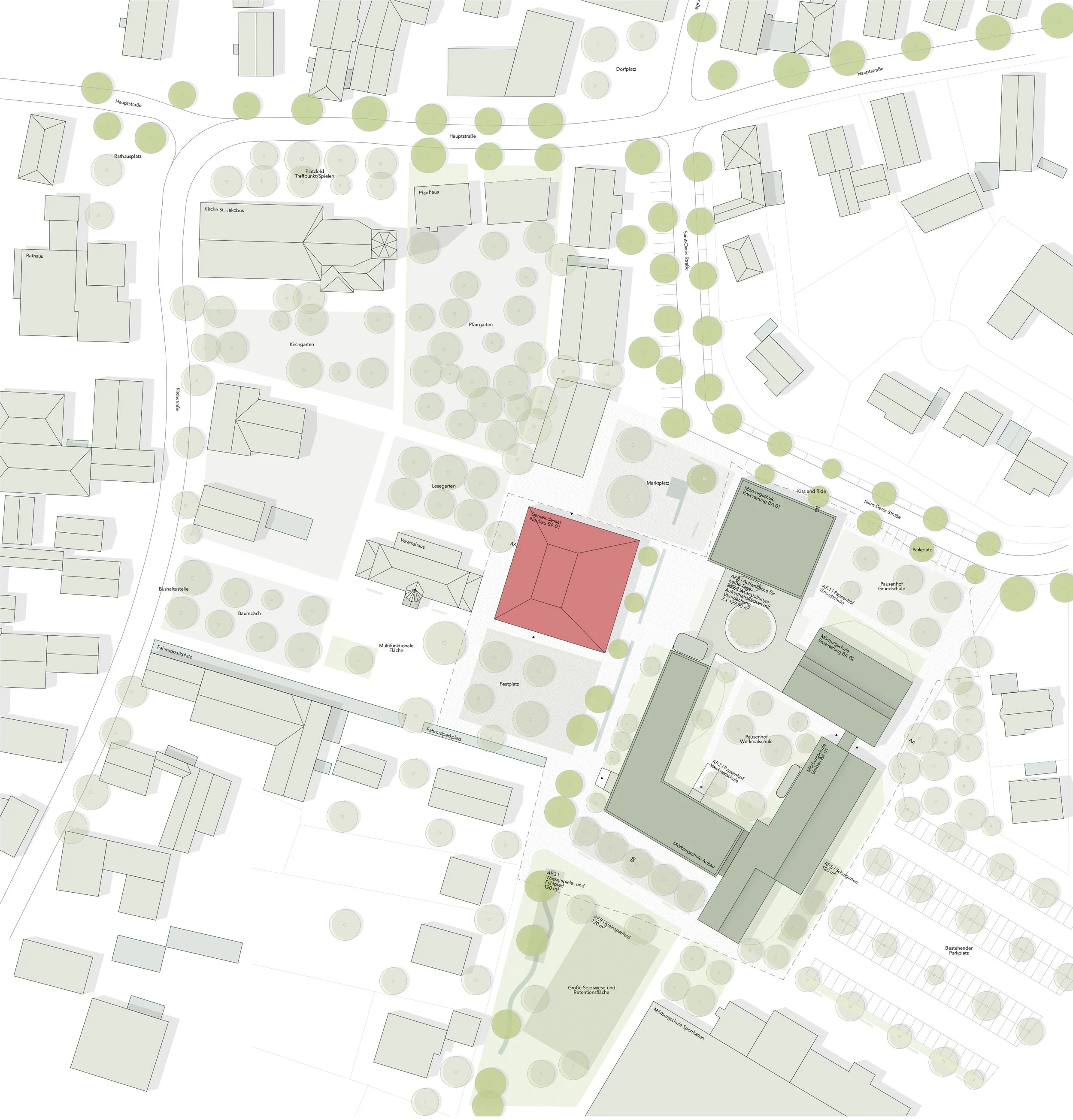 Das neue Gemeindehaus und die Mörburgschule stärken die Ortsidentität von Schutterwald und fördern die Gemeinschaft durch ihre zentrale Lage am Marktplatz. Das Rahmengebende Konzept „Drei Plätze - Eine Mitte“ aus dem städtebaulichen Verfahren wird damit umgesetzt und schafft lebendige Freiräume zwischen Dorfplatz, Marktplatz und nun auch dem Schulplatz.